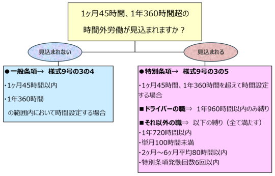 2024年4月以降に36協定を締結する場合の書式は、ドライバーとかの職種に関係なく、「様式9号の3の4」または、「様式9号の3の5」となります。違いは、限度時間を超えて時間外労働をさせる必要があるか否かです。要するに特別条項が必要か否かということです。下記に、判断の目安を記しましたのでご参考になればと思います。