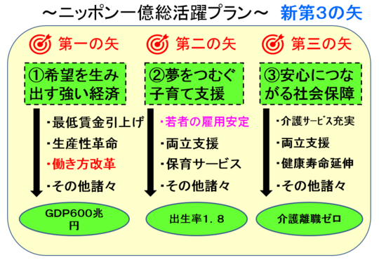 働き方改革関連法が本年6月に可決成立しました。2019年4月から順次、労働基準法を始めとする関連法令の改正が施行されます。働き方改革は単独で機能するものではなく、図で示すように「ニッポン一億総活躍プラン」の新第三の矢の一つである「希望を生み出す強い経済」に組み込まれた一施策に過ぎません。特徴的なのは、罰則を以て実施を義務づけているところです(一部の施策)。
