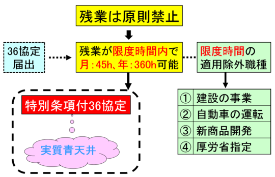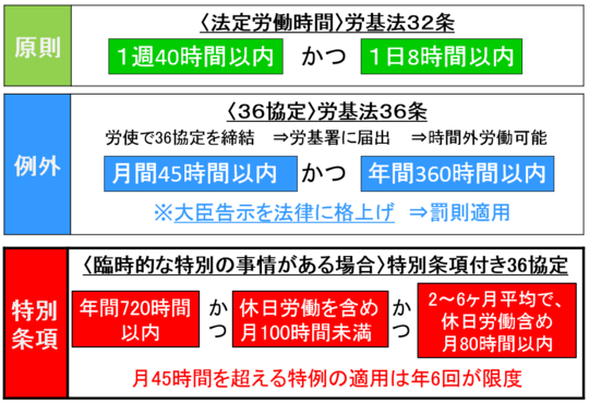 労働基準法では、残業は原則禁止で罰則の適用もあります。そこで適正な36協定を届け出れば罰則の適用が免れます(免罰効果)。残業時間が月45時間以内、かつ、年間360時間以内であれば「通常の36協定」で対応可能です(図の中段中央)。