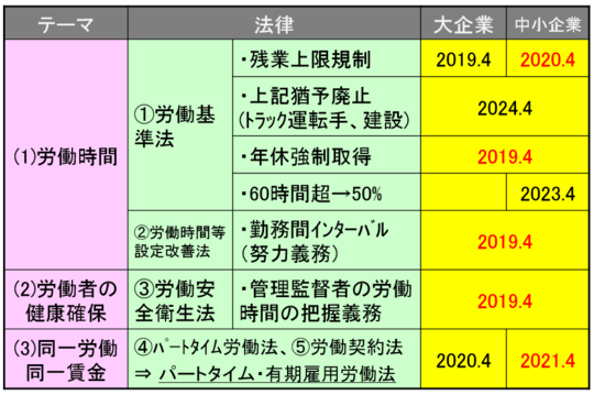 時系列でスケジュールを作成してみました(下図)。勤務間インターバルは努力義務、同一労働同一賃金については今後「パートタイム・有期雇用労働法(略称)」という新法を根拠に、行政指導が実施されます。