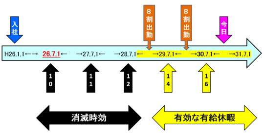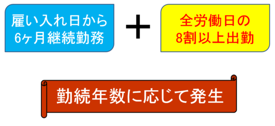 有給休暇は勤続年数と出勤率の2つ要件を満たしたときに発生します。意外と見落としがちなのが出勤率の算定です。出勤すべき日の8割のチェックをしていない企業さんがたまに見受けられます。出勤不良の社員のケースでは、6ヶ月後に有給休暇が発生しないこともあります。「全労働日」とは、雇用契約書に記載された本来出勤すべき日と捉えても問題ないでしょう。