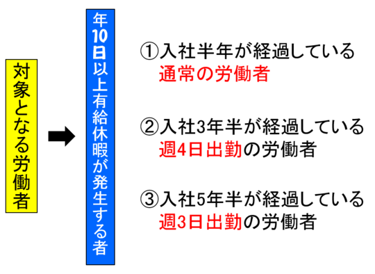 対象となる労働者ですが、下図にまとめてみました。年10日以上有給休暇が発生する労働者が対象となります。ポイントは、年10日以上の有給休暇が何時付与されるかです。次のいずれかの3パターンになります。
