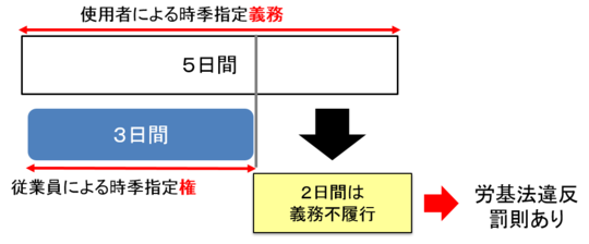 使用者は、労働基準法第39条第1項から第3項までの規定により使用者が与えなければならない年次有給休暇(以下「年次有給休暇」という。)の日数が10労働日以上である労働者に係る年次有給休暇の日数のうち、5日については、基準日(継続勤務した期間を同条第2項に規定する6箇月経過日から1年ごとに区分した各期間(最後に1年未満の期間を生じたときは、当該期間)の初日をいう。以下同じ。)から1年以内の期間に、労働者ごとにその時季を定めることにより与えなければならないものであること。