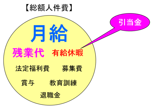 月給だけが人件費じゃないと言うことをこの図で表現しています。様々な諸費用を見積もれば自ずと月給の数字がイメージ出来ると思います。これまでは、「残業代を費用計上した月給をイメージして下さい」と、アドバイスしてきましたが、今後は、「有給休暇は全部消化されると想定して月給をイメージして下さい」というフレーズも加わりそうです。