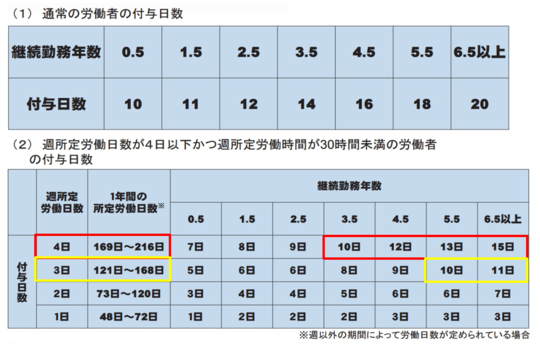 ザックリと言い換えれば、社会保険に加入していない週4日以下勤務の労働者となるでしょうか。週の所定労働日数(1日~4日)に応じて、図下段の表の様に有給休暇が付与されます。これを「比例付与」と言います。