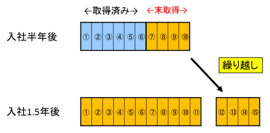 有給休暇の有効期間は付与日から2年間です。ですから基準日に発生した有給休暇は翌年に繰り越すことができます。繰り越した有給休暇および翌年の基準日に付与された有給休暇の合計が本人の残日数となります。例えば、下図で説明してみましょう。入社半年で10日付与された従業員が6日消化して、1年後11日付与された場合は、未消化の4日分と、新規付与分の11日を合計して15日が有給休暇の残日数となります。