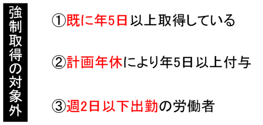 対象とならない労働者を、下図にまとめてみました。労働者自身の申し出により既に5日以上の有給休暇を取得している場合や、5日以上の計画年休を運用している場合は強制取得の対象とはなりません。